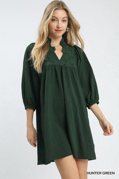 3/4 Sleeve Mini Dress With Embroidery - Hunter Green