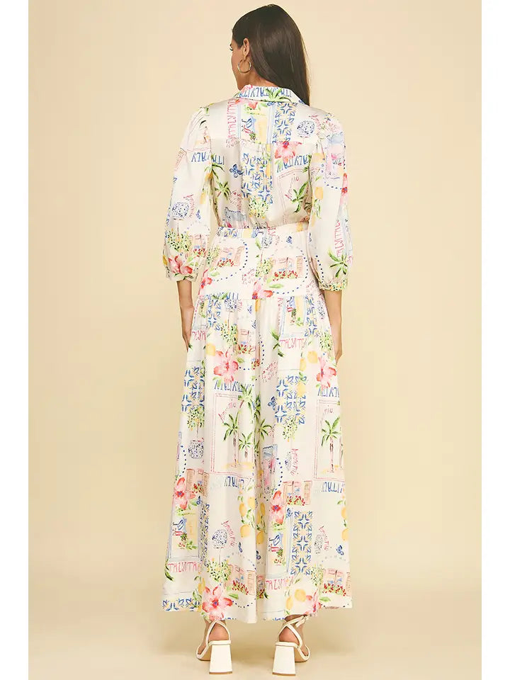 Chic and ready for anything, this cream multi print button-down maxi dress brings together timeless style with modern flair. The flattering V-neck and full-length silhouette create an elegant foundation, while playful balloon short sleeves with tucked details add personality and movement. Button-front closure makes dressing a breeze, and the maxi cut works beautifully for both casual outings and dressed-up occasions. Pair it with the matching skirt for coordinated versatility. Model wears size small.