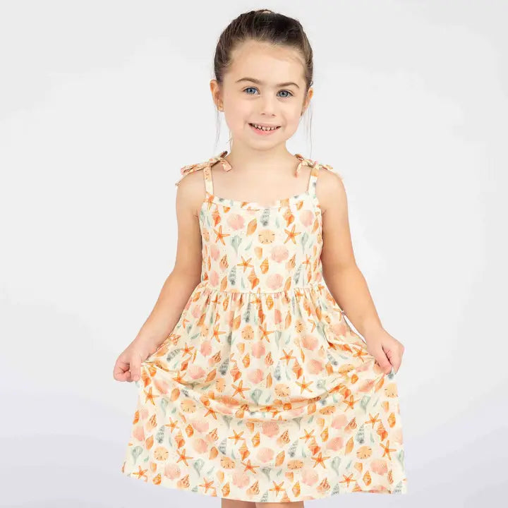 The softest bamboo sundresses for girls now in our Sandy Seashells pattern. This daywear full of pretty shells is perfect for spring and summer. Don't forget to see other styles in this print for a cute sibling match!