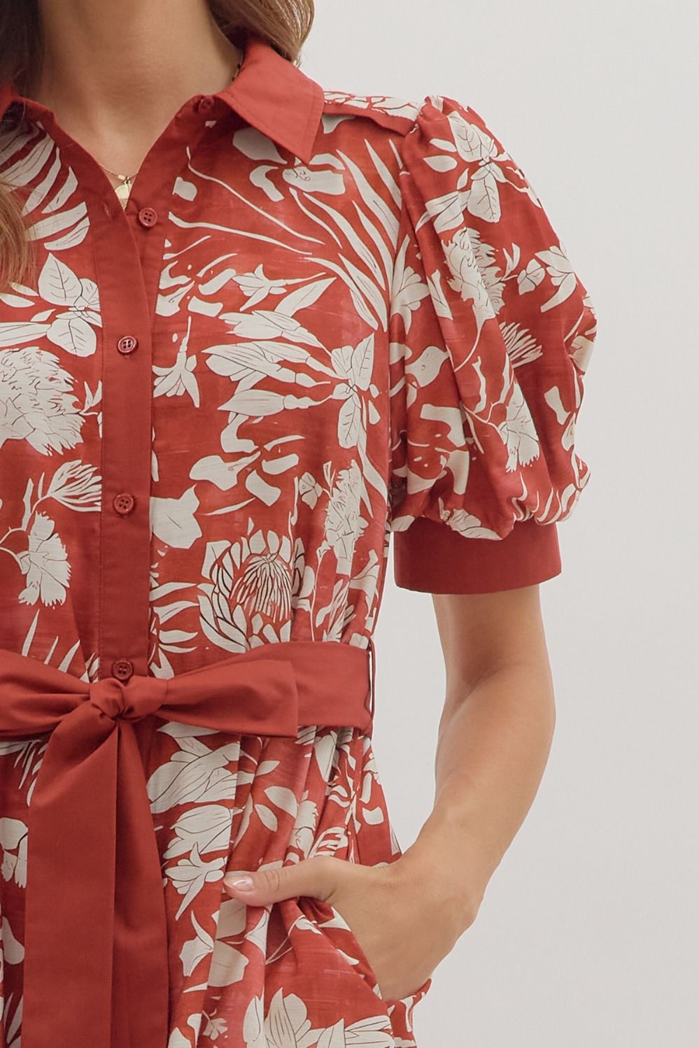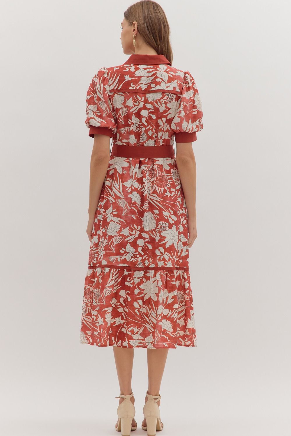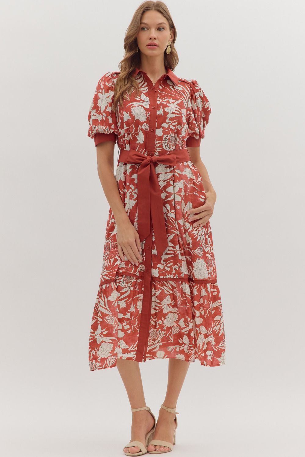 Floral print short puff sleeve tiered midi dress featuring button front and collared neckline. Self-tie at waist. Side pockets. Lined. Woven. Non-sheer. Lightweight.