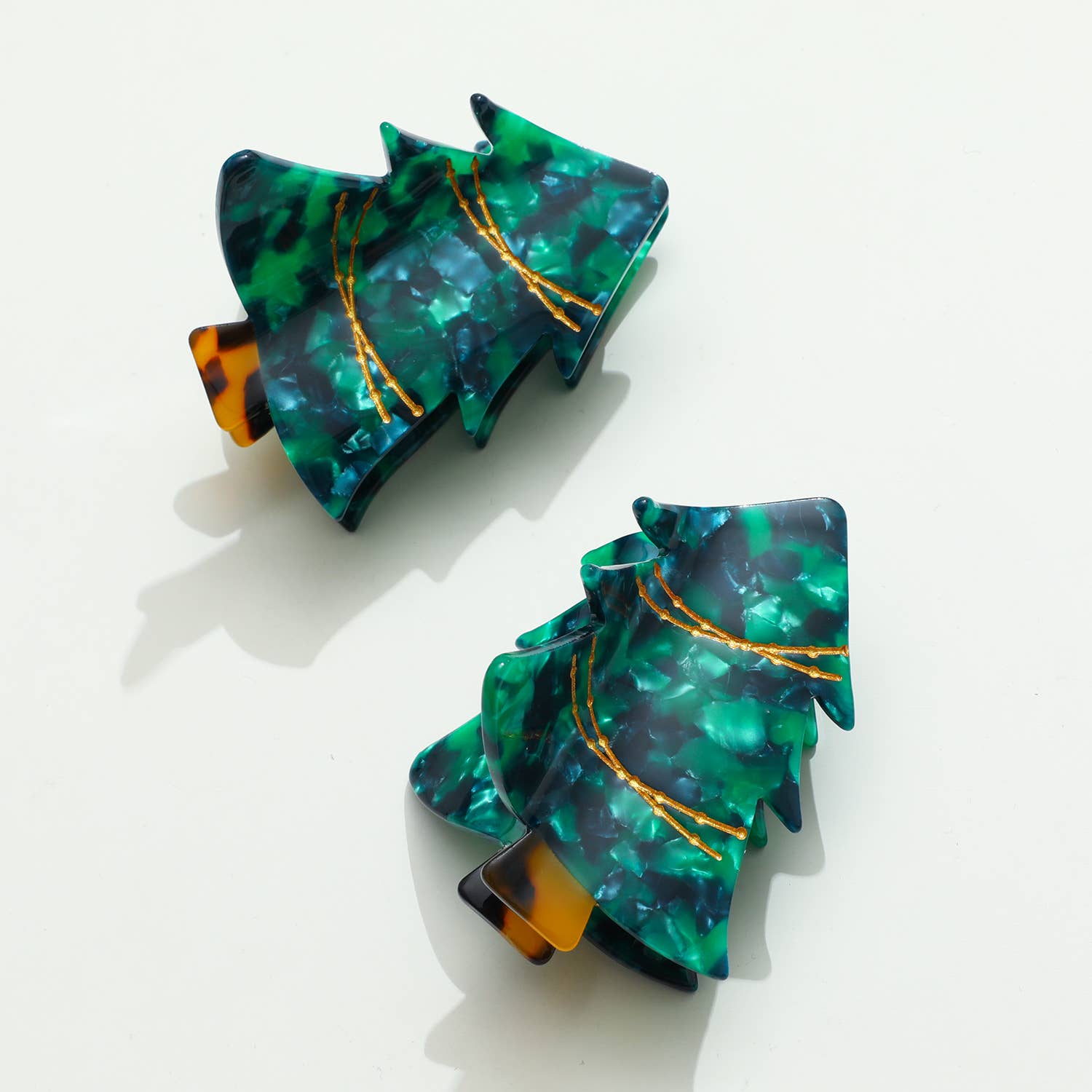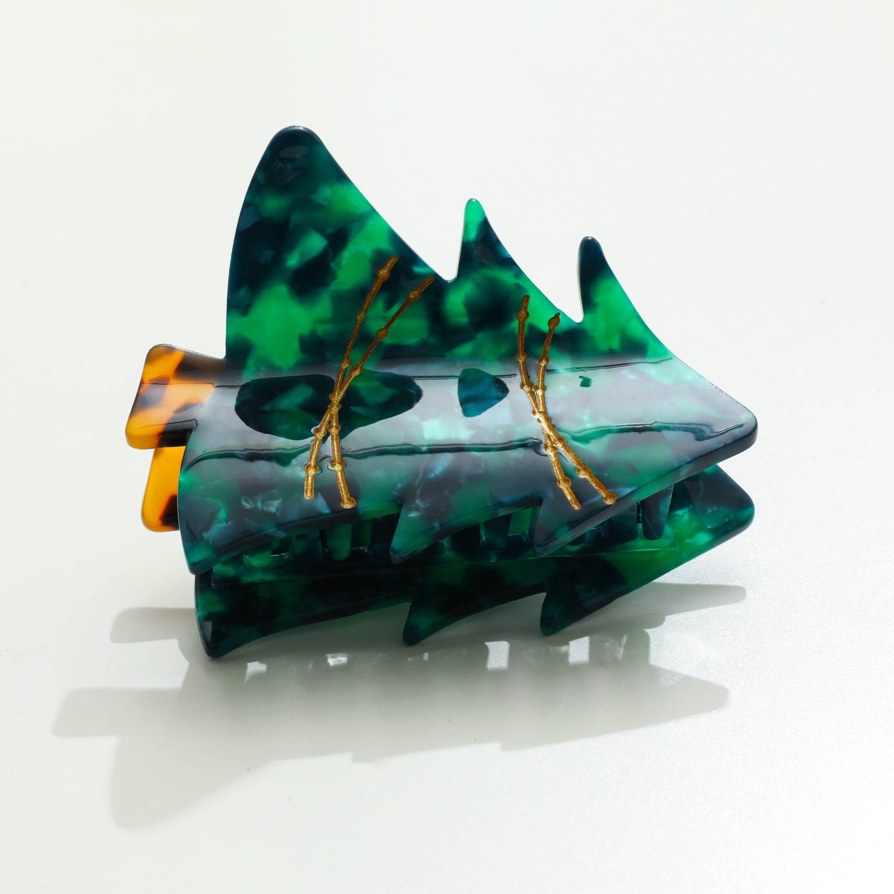 Holiday is here with our festive Christmas tree featuring gold painted details and a green marbled tree with a tortoise trunk.