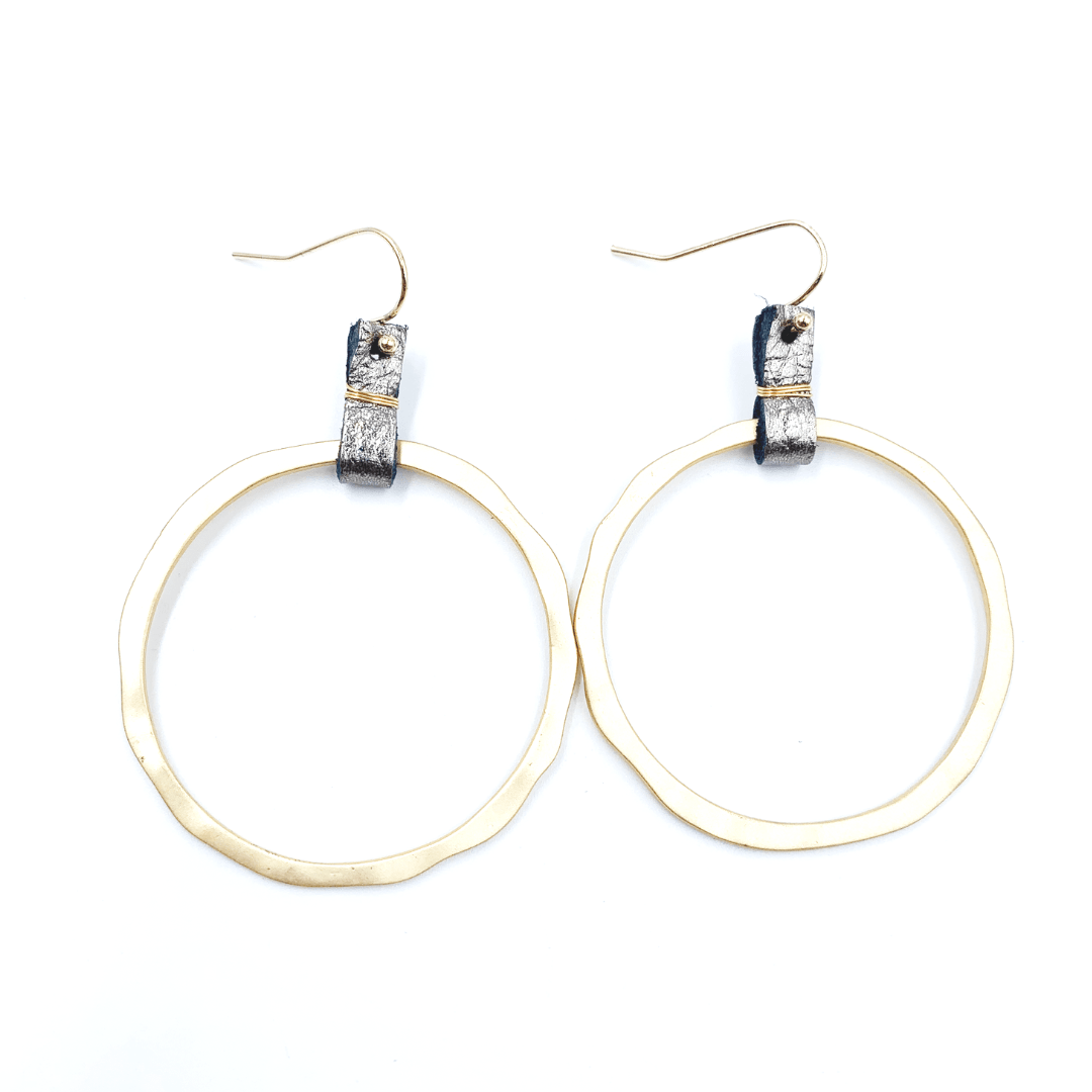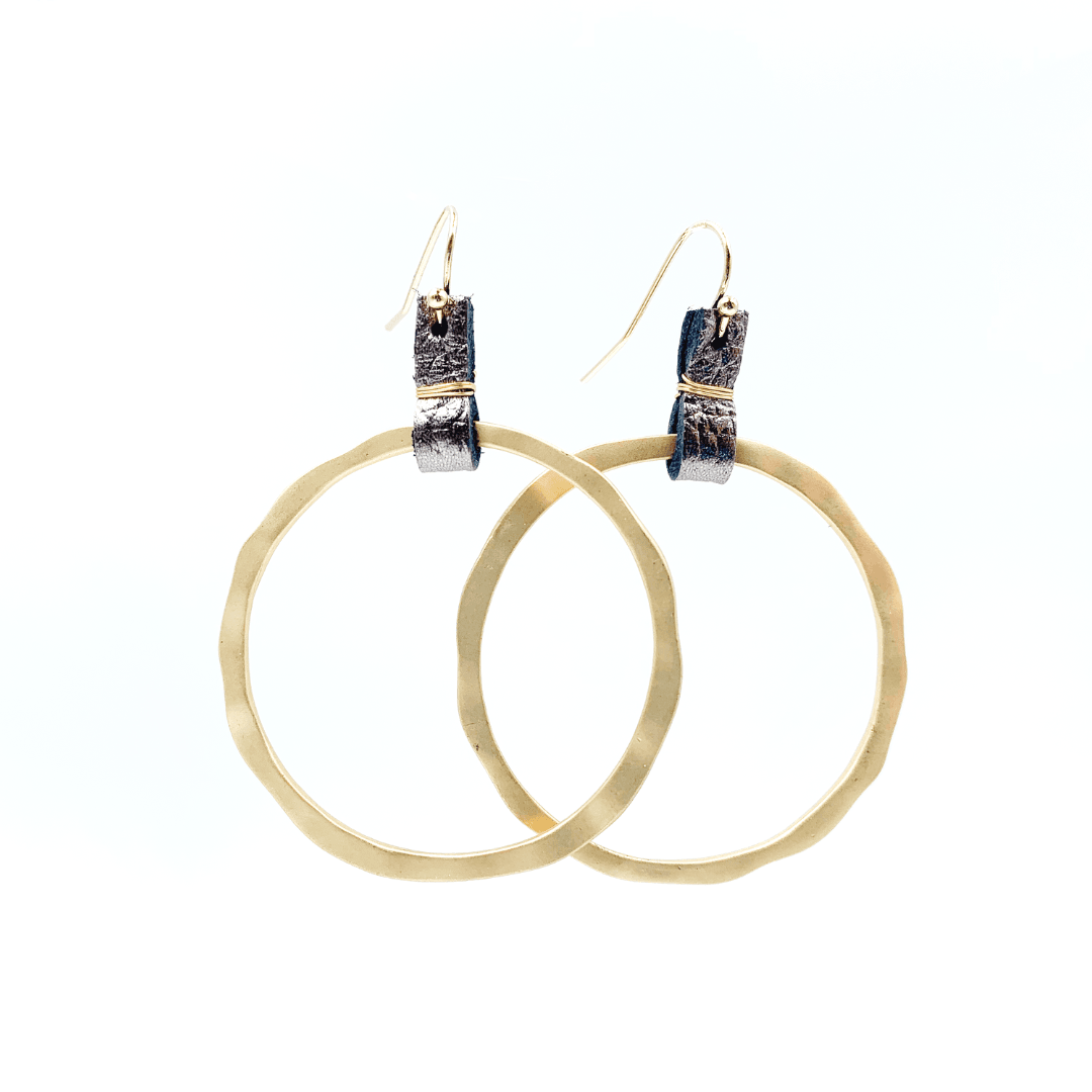 Elevate your look with these elegant front-facing hoop earrings, featuring a 24k brushed gold finish and accented by a slender strip of leather in a stunning pewter bronze shade. Perfectly blending style and refinement. E-LHPW