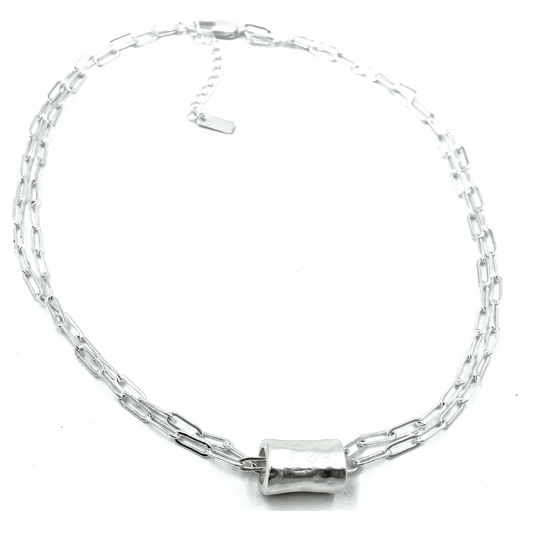 Part of the erin gray barrel collection. Our brushed silver barrel pendant on a silver double chain is sleek and slightly edgy.