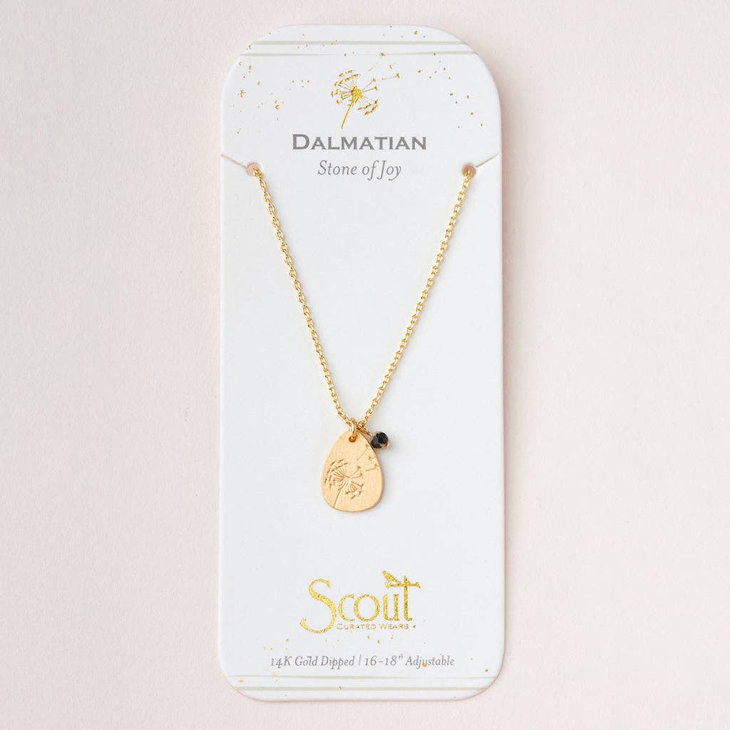 Shaped with meaning. Tiny semi precious gemstones pair with etched icon charms that reflect the positive properties of each stone. • Materials: charm with icon, 3mm faceted semi-precious stone bead adjustable brass chain, logo tag, lobster clasp • Every charm is engraved with an icon that reflects the stone's properties • 14K Gold or Sterling Silver dipped 16"-18" adjustable chain • Presented on cards that tell the meaning and properties of each stone Dalmatian Jasper | Stone of Joy