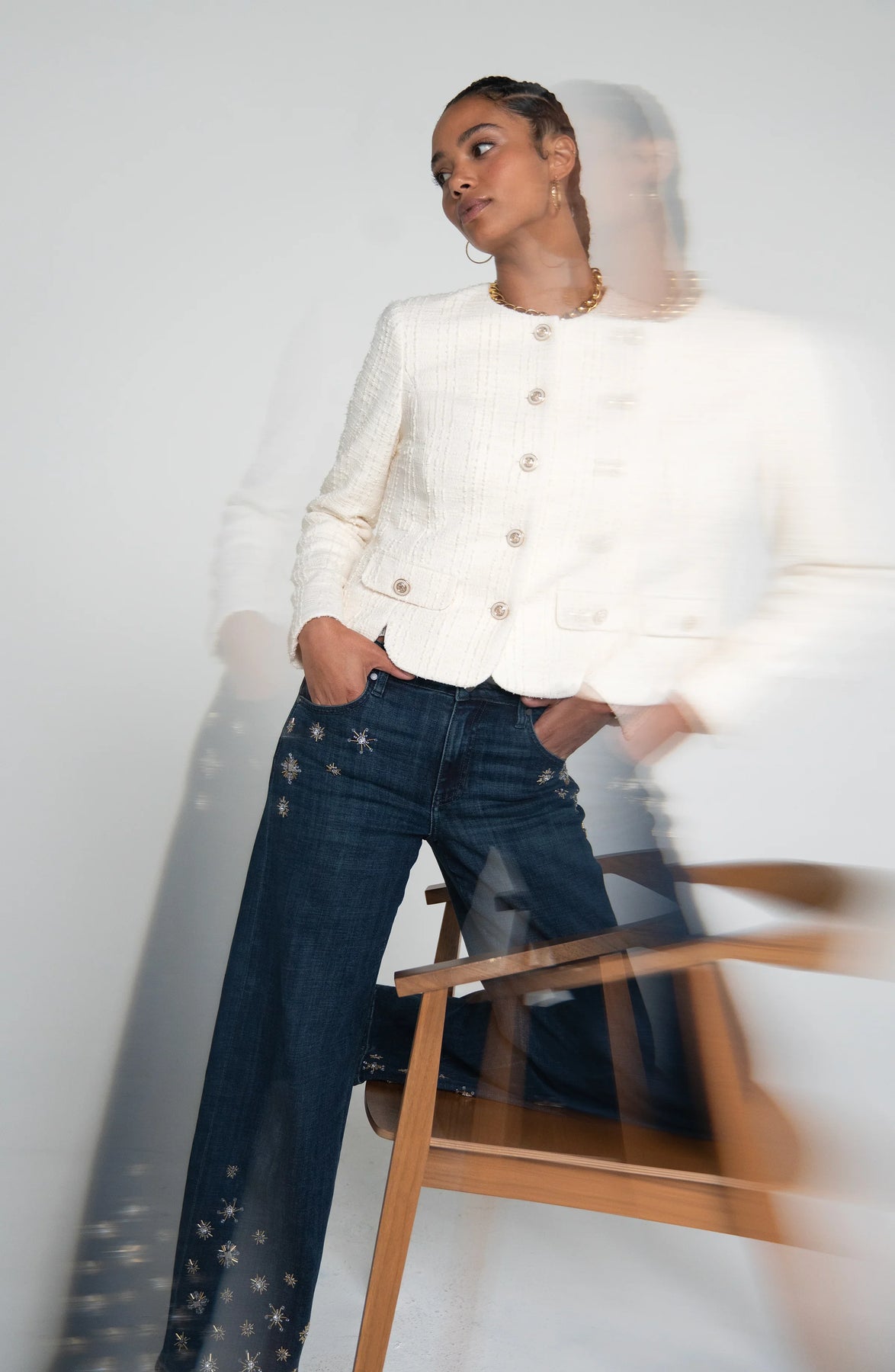 n expression of understated glamour. This deep indigo wide leg is adorned with light-catching crystal clusters that create a refined shimmer across the leg. Designed to flatter with our signature soft stretch and elevated structure, it brings a touch of luxury to everyday denim.