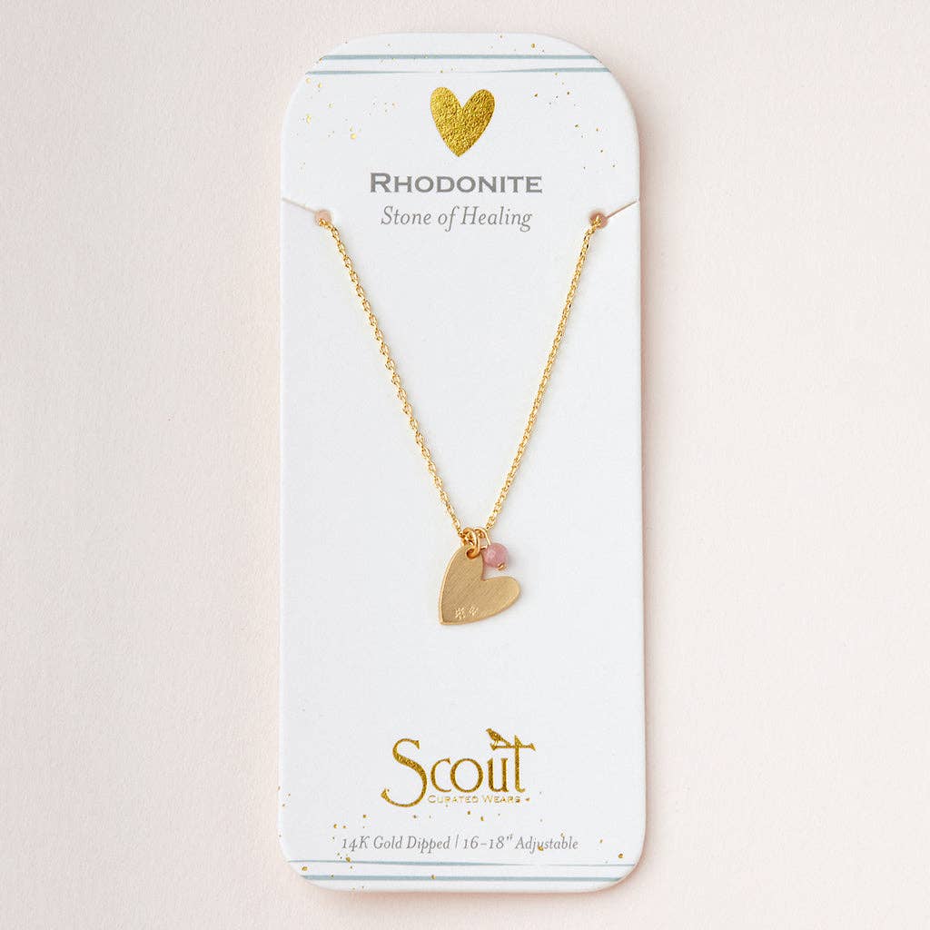 Shaped with meaning. Tiny semi precious gemstones pair with etched icon charms that reflect the positive properties of each stone. • Materials: charm with icon, 3mm faceted semi-precious stone bead adjustable brass chain, logo tag, lobster clasp • Every charm is engraved with an icon that reflects the stone's properties • 14K Gold or Sterling Silver dipped 16"-18" adjustable chain • Presented on cards that tell the meaning and properties of each stone Rhodonite | Stone of Healing