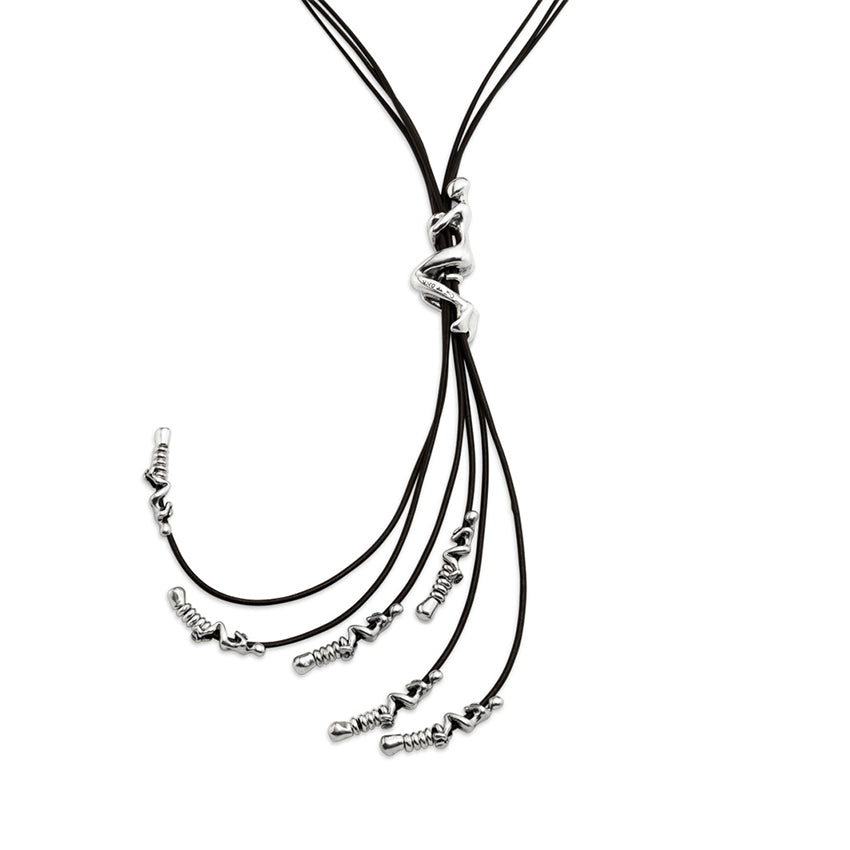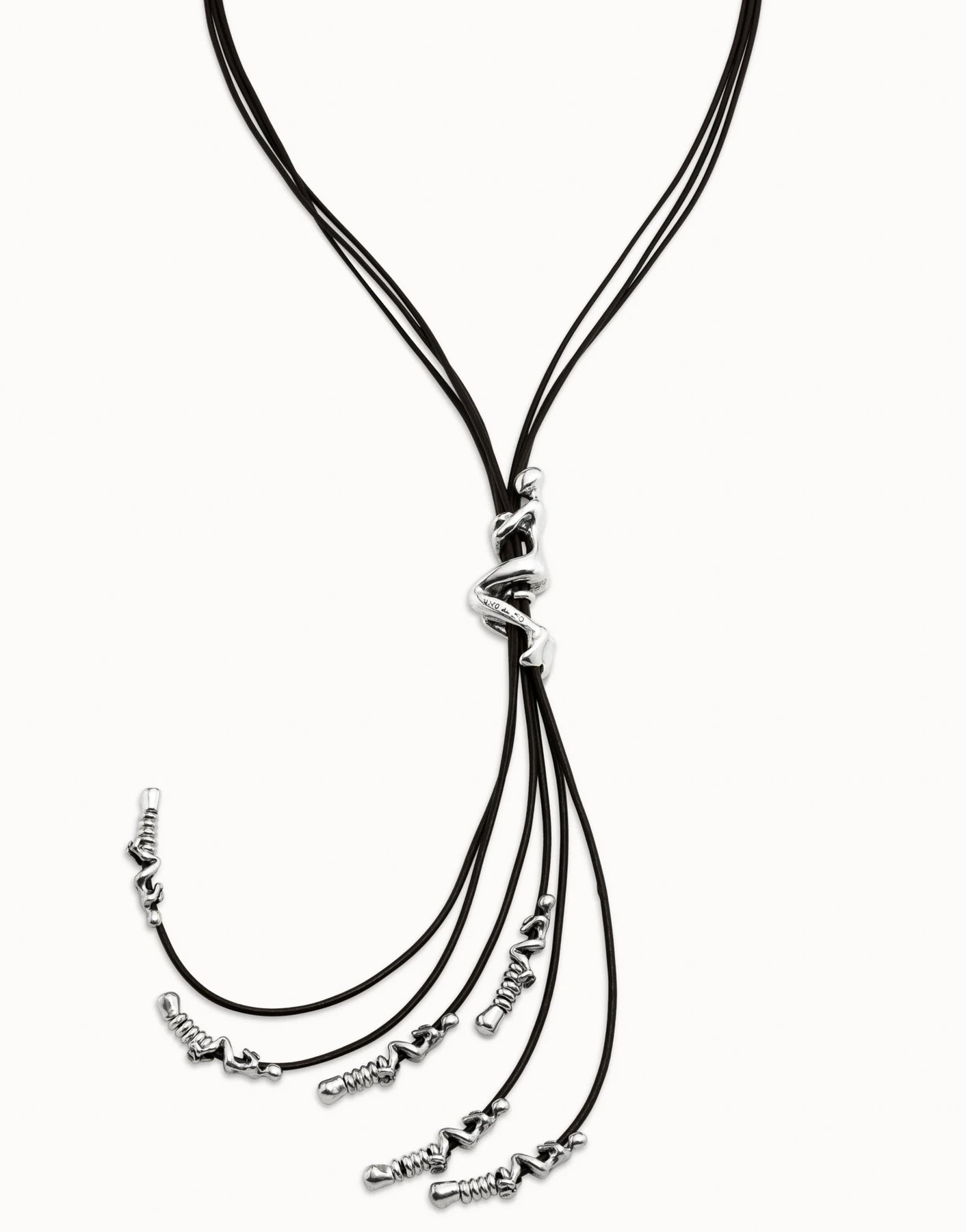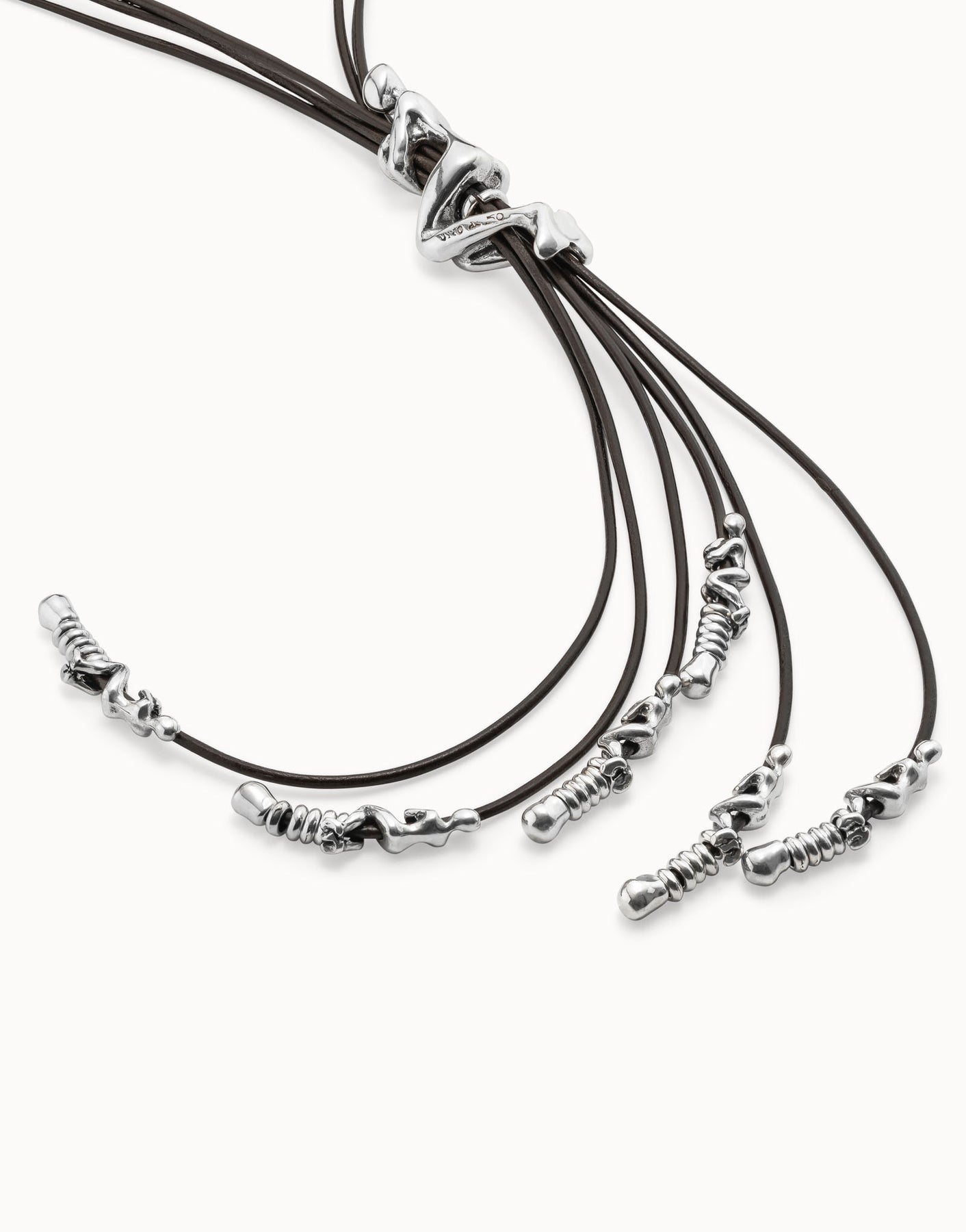 Long necklace made of dark brown leather cords with sterling silver-plated metal pieces at the ends. This jewel has been made in Spain under a 100% handcrafted process.