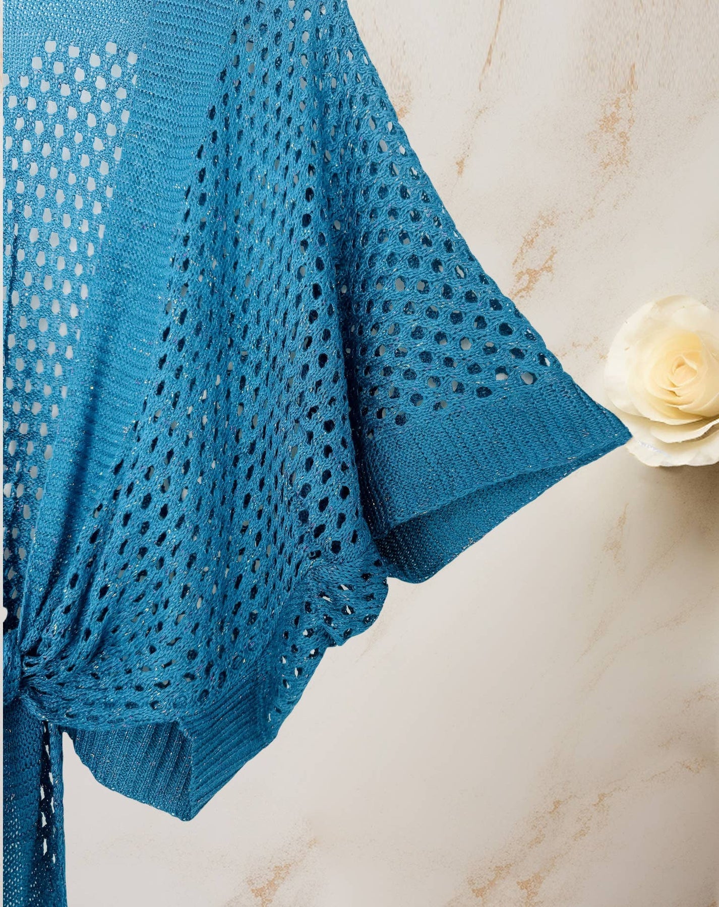 Eyelet Open-Knit Metallic Cardigan with Front Tie
