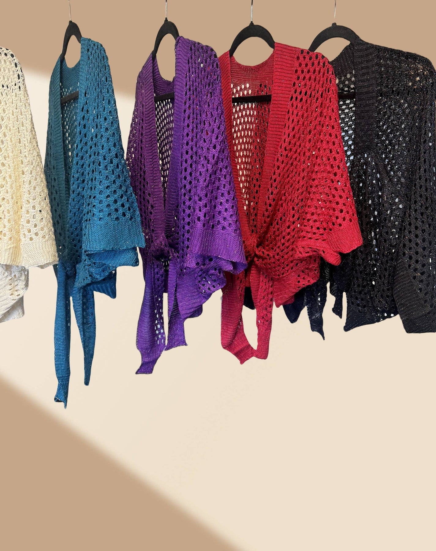 Open-knit cardigan with metallic thread accents, featuring sleeves, a front tie. 100% acrylic One size