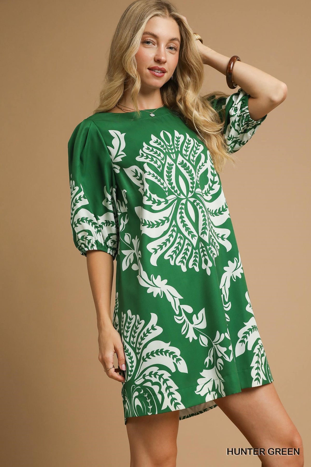 Bold Floral Puff Sleeve Mini Dress - Hunter Green