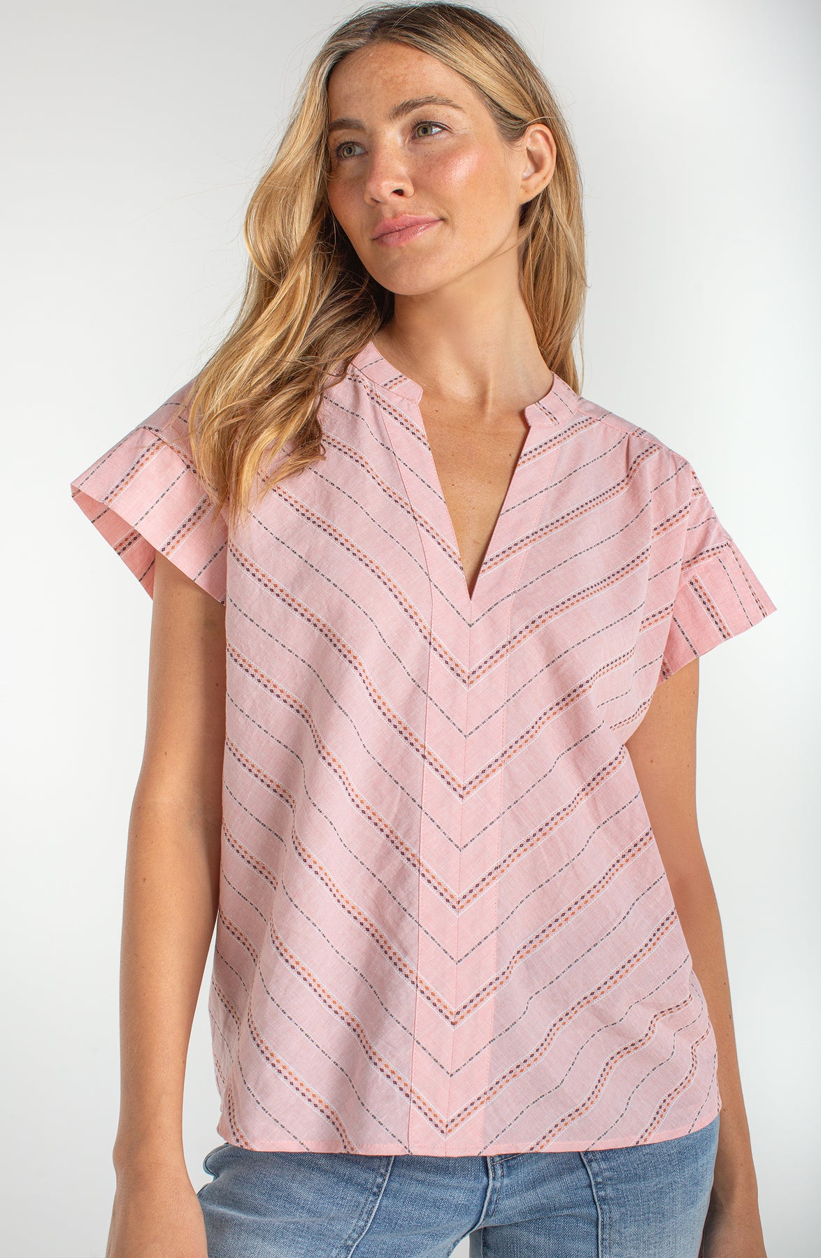 Liverpool Short Sleeve Popover Woven Top - Pink Multi Stripe