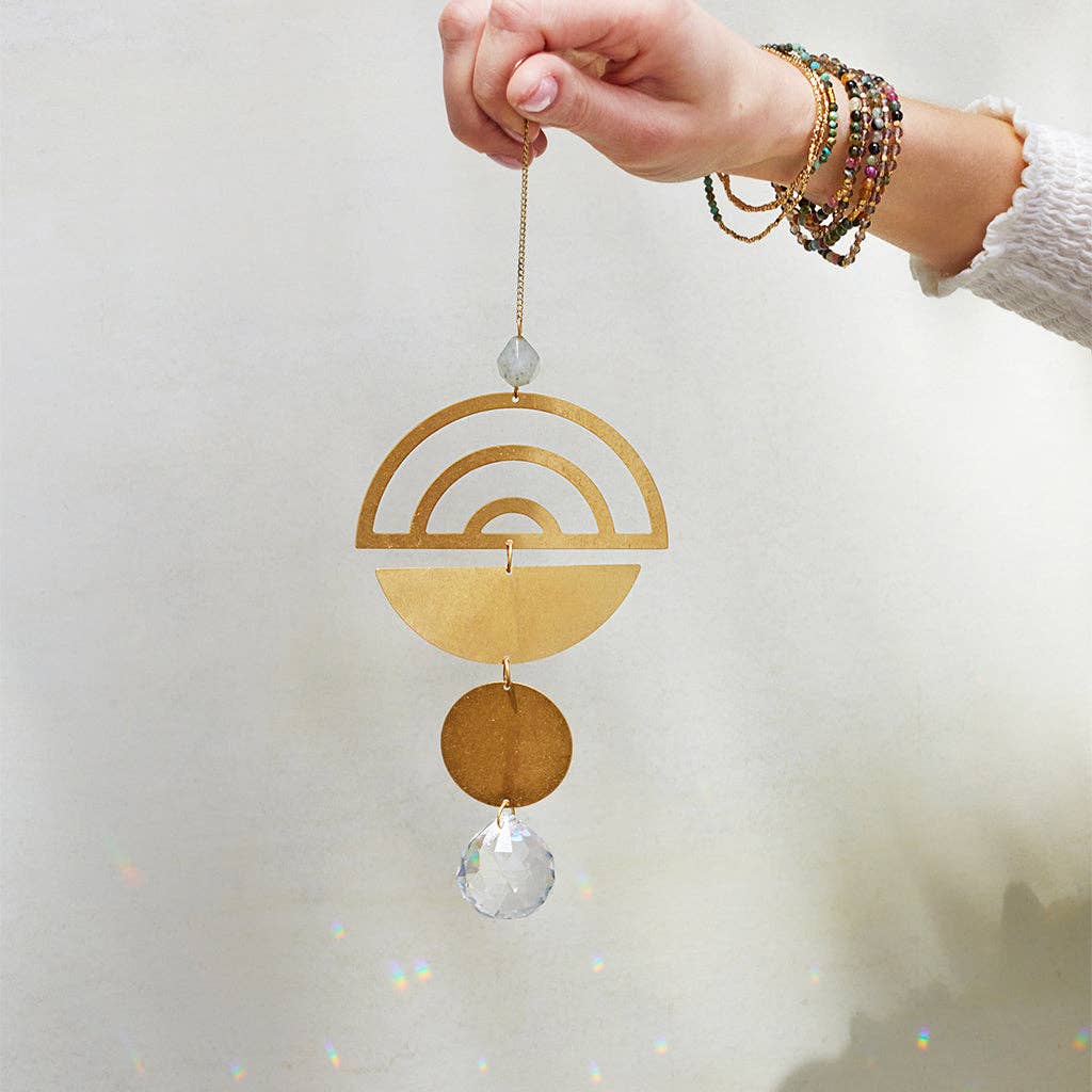 Captured sunlight transforms into beautiful rainbows that spread joy.Crafted from brass, semi precious gemstones and crystal.