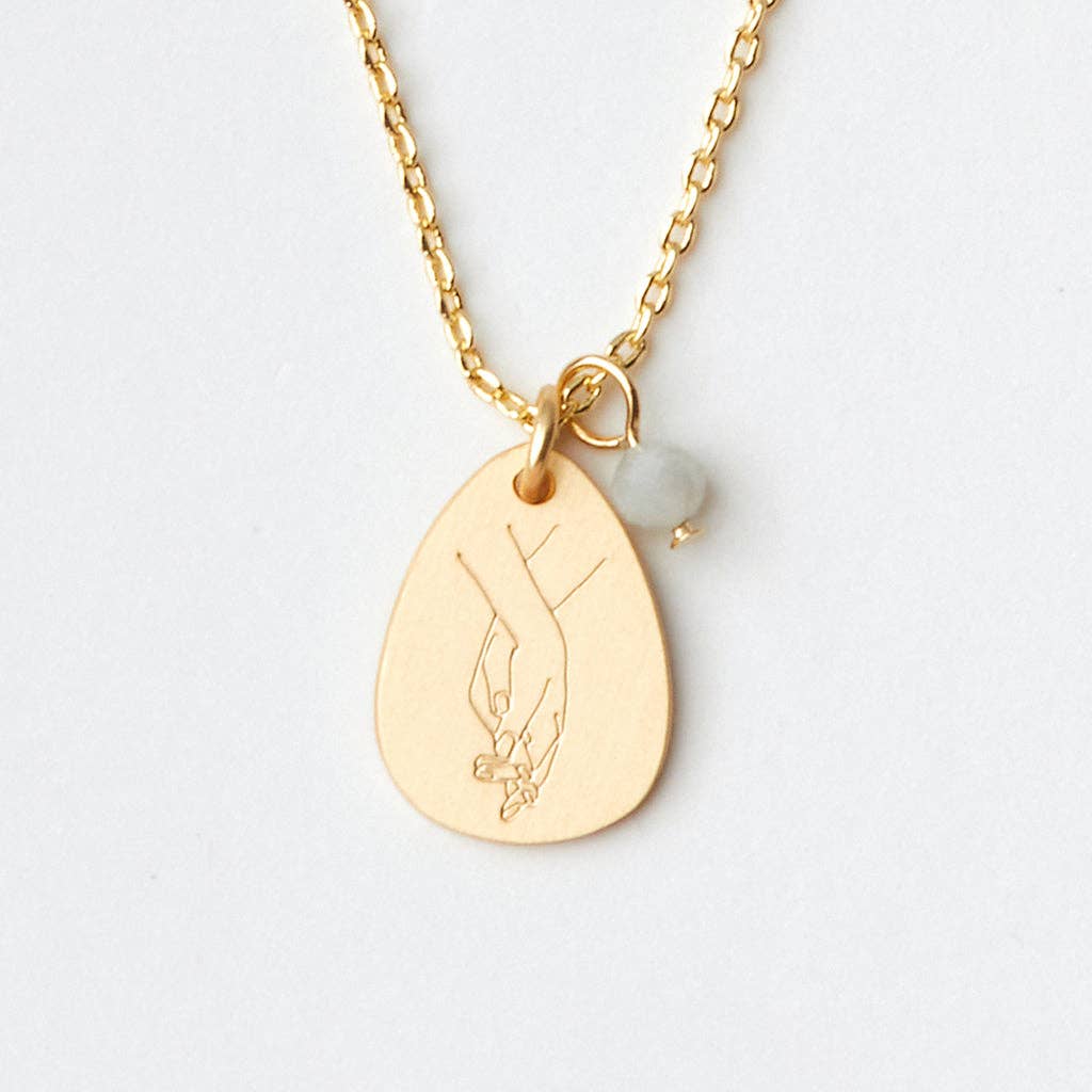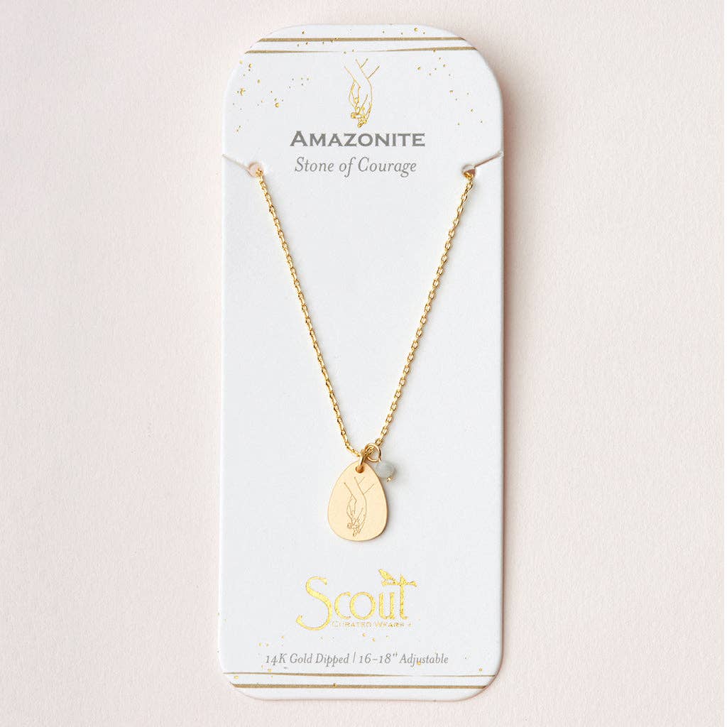 Shaped with meaning. Tiny semi precious gemstones pair with etched icon charms that reflect the positive properties of each stone. • Materials: charm with icon, 3mm faceted semi-precious stone bead adjustable brass chain, logo tag, lobster clasp • Every charm is engraved with an icon that reflects the stone's properties • 14K Gold or Sterling Silver dipped 16"-18" adjustable chain • Presented on cards that tell the meaning and properties of each stone Amazonite | Stone of Courage