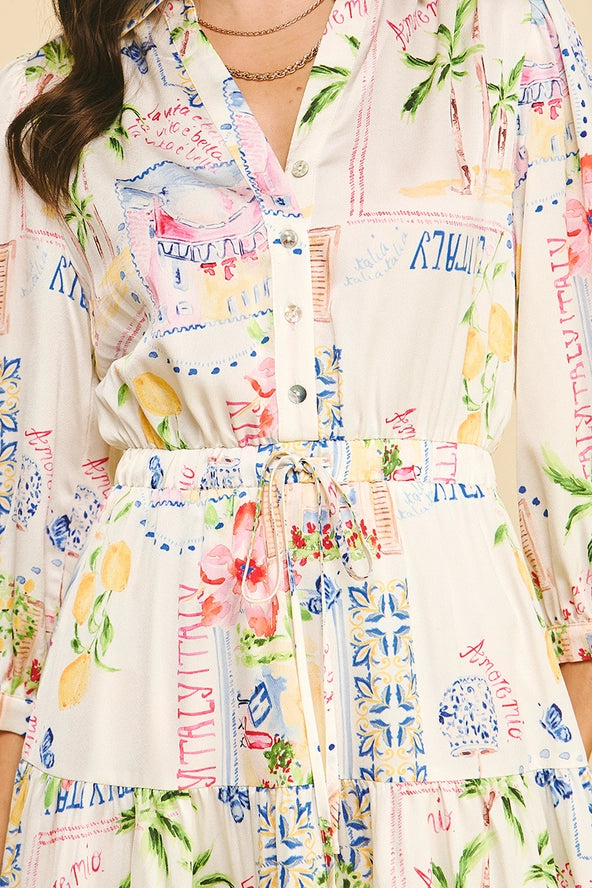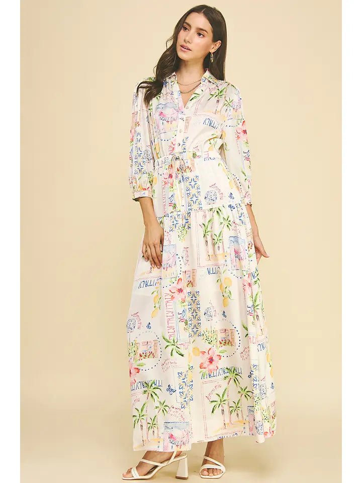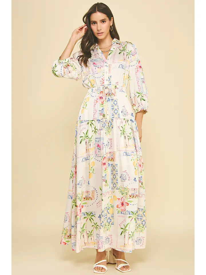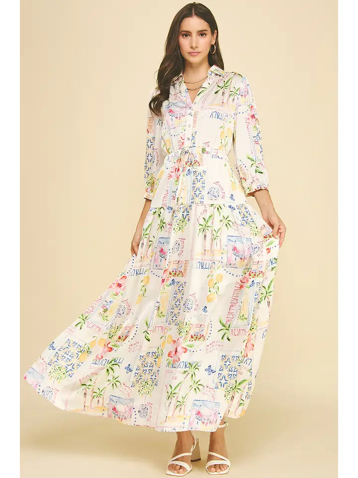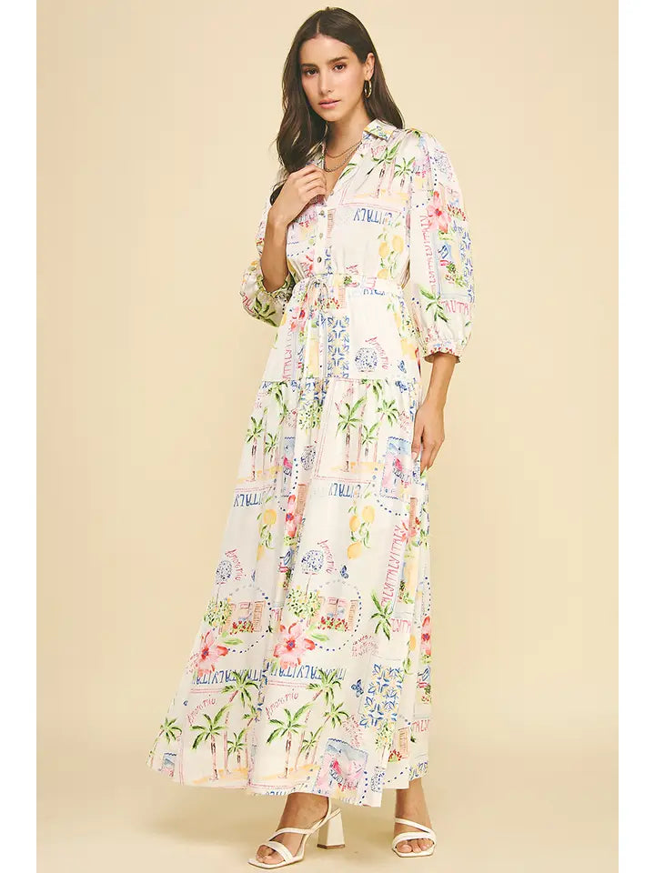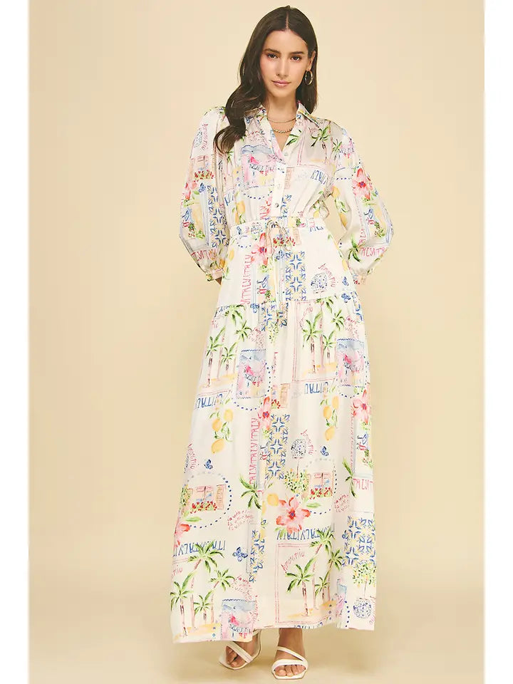 Chic and ready for anything, this cream multi print button-down maxi dress brings together timeless style with modern flair. The flattering V-neck and full-length silhouette create an elegant foundation, while playful balloon short sleeves with tucked details add personality and movement. Button-front closure makes dressing a breeze, and the maxi cut works beautifully for both casual outings and dressed-up occasions. Pair it with the matching skirt for coordinated versatility. Model wears size small.